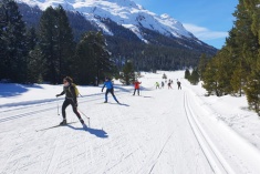 De dag start met een uur langlaufles in het langlaufstadionnetje van Pontresina. De techniektips helpen je bij de dagtocht door het betoverende Val Roseg. Als je nog na het legendarische taartenbuffet bij hotel Rosegg nog puf heb kun je nog een paar kilometer door tot de gletscher, waar je direct zicht hebt op de machtige Piz Roseg. De tocht is klassiek, voor skating is er een alternatief. Terug suizen we over de dalende loipe naar Pontresina, waarna de rode groep nog de ronde naar Celerina maakt.