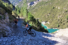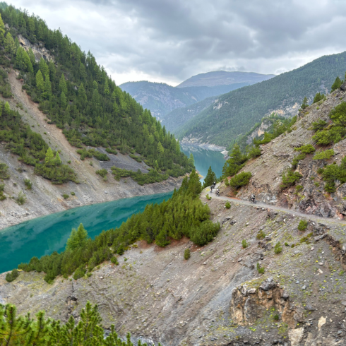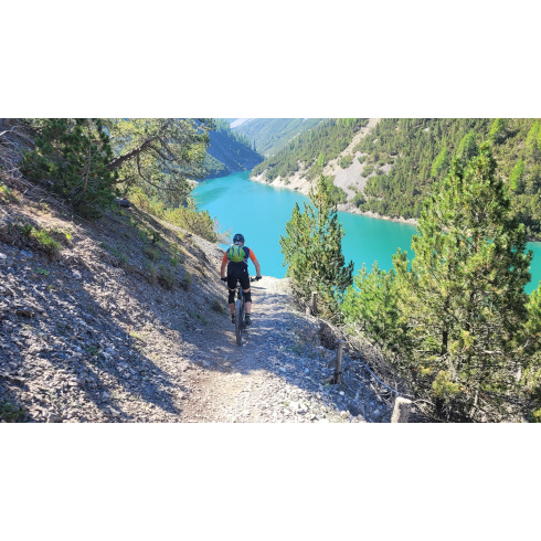 Deze laatste etappe start met één van de spectaculairst trails van de Alpen: de Goldseetrail. Onder het oog van de Ortler met de prachtige gletscher dalen we af over dit paadje langs een steile afgrond. Wie last heeft van hoogtevrees hoeft deze trail niet te rijden. Na de Bimbantrail rijden we terug naar de Stelvio en vanaf door over heerlijke singletrails, klimmend maar vooral dalend, naar het Lago di Cancano. Vanaf daar rijden we langs de meren naar de andere kant en beklimmen de Passo Gallo. Bovenop verbaas je je over het overweldigende landschap. Tijdens de fijne afdaling met veel haarspeldbochten komt het azuurblauw van het Lago di Livigno steeds dichterbij. Daarna rijden we langs het Lago di Fraele, waar we lunchen .Na een steile klim bereiken we de Alpe Trele, waar het terras vol is met mountainbikers. Nog één klim en dan genieten we van de laatste singletrailafdaling van deze week. Heb je ooit wel eens een reis gedaan met zo veel singletrails?