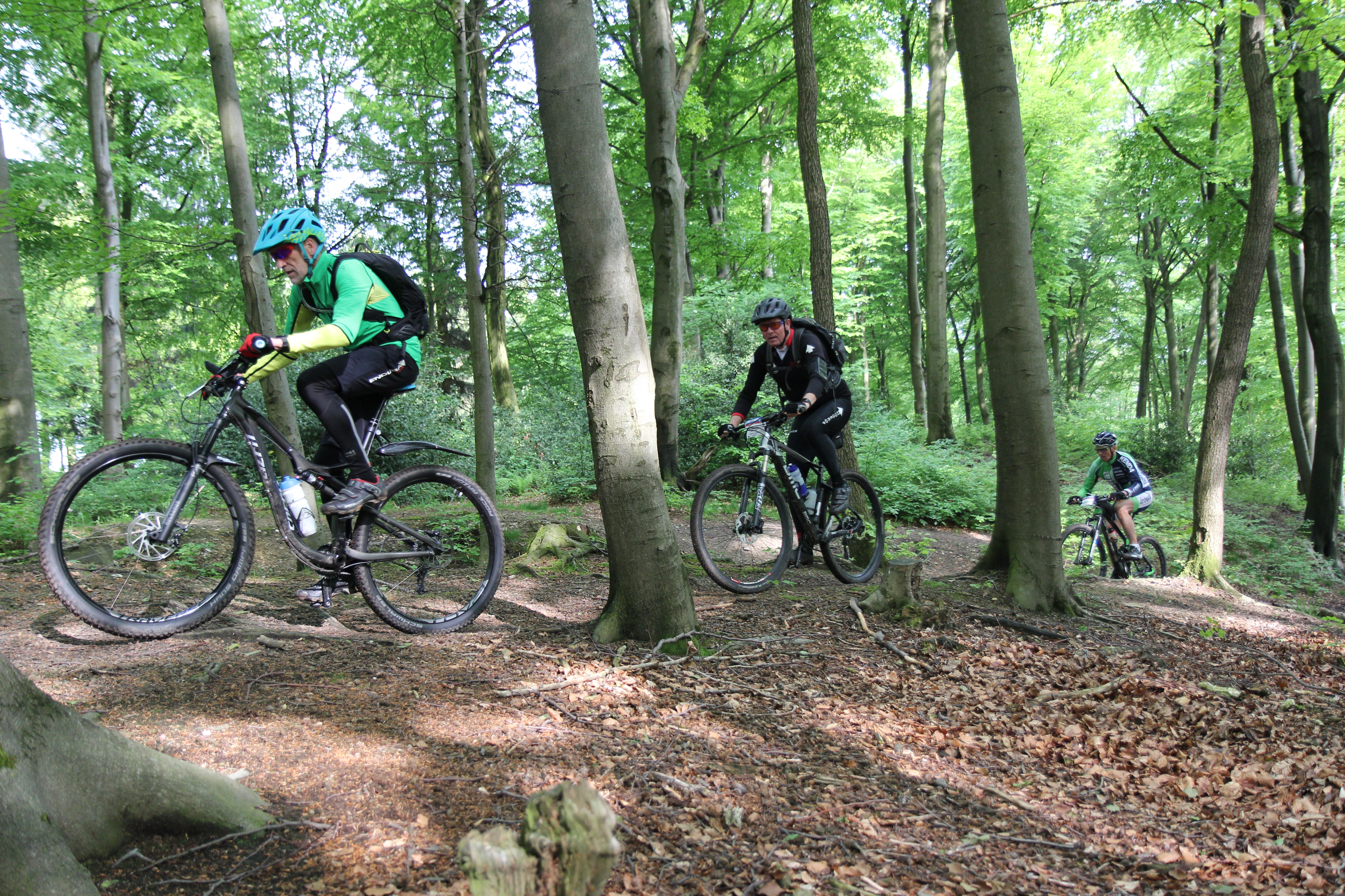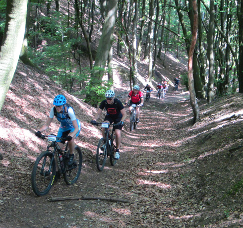 Tijdens de derde etappe van dit weekend biken we eerst over mooie trails naar Tecklenburg en maken vanaf daar een gote lus naar Hasbergen. We mijden daarbij de drukste wandelpaden van het Teutoburger Woud, die op zondag altijd "dicht bevolkt" zijn Gelukkig zijn er nog veel trails die ook de moeite waard zijn. De afwisseling tussen open stukken door de weilanden en stukken door het bos is erg mooi. Moe en voldaan biken we over de laatste downhilltrail naar het hotel. Daar kunnen we nog douchen in het zwembad voordat we weer naar huis rijden.